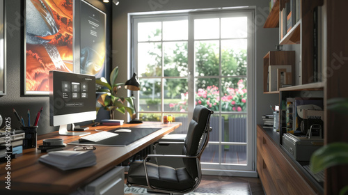 office, modern, comfortable, desk, computer, technology, stylish, home, workspace, creative, design, plant, furniture, setup, business, environment, cosy, elegance, essential, fashionable, horizontal, indoor, laptop, order, photo, study, tech, trendy, window, working, chair, color image, compact, appliance, empty, ergonomic, accessory, clean, domestic life, equipment, freelancer, lifestyle, background, table, wooden, contraption, aesthetic
