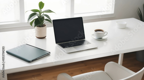 Modern workspace featuring laptop, notebook, coffee cup, and potted plant. Bright, minimalist design enhances productivity and focus.