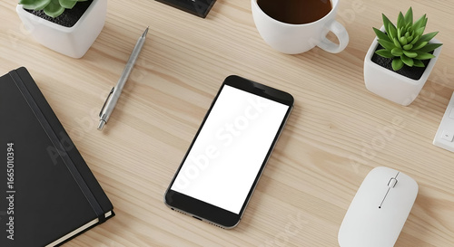 smartphone, phone, mobile, device, screen, blank, workspace, office, desk, modern, technology, business, work, computer, mouse, keyboard, hot drink, cup, plant, notebook, pen, table, wood, top, view