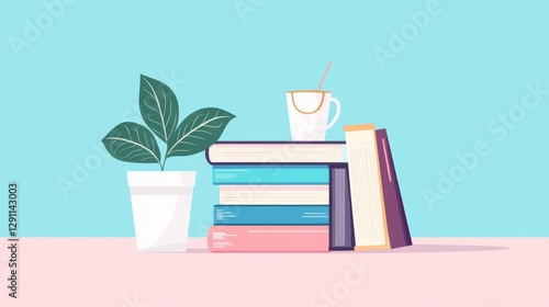 Modern workspace setup featuring stacked books, a green plant, and a cup with a straw, ideal for studying and boosting creativity