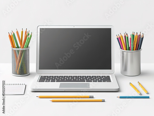 Modern Workspace with Laptop and Colorful Stationery