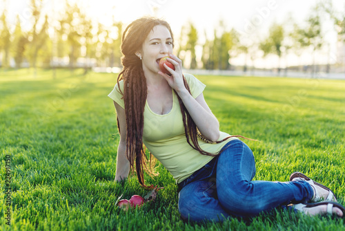 Modern young girl with a hairstyle dreadlocks in the Park on a green meadow eating apples and enjoying the autumn mood