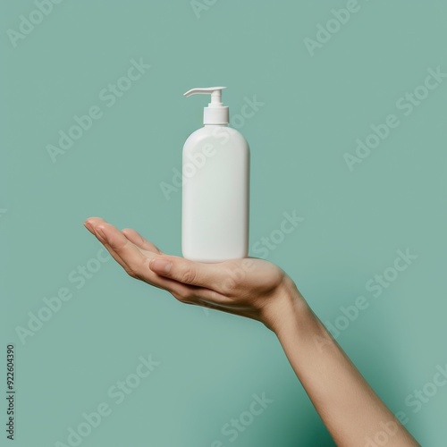 Moisturizing Lotion Display, a hand elegantly holds a pristine white bottle against a calming mint green backdrop, emphasizing simplicity and skincare focus.