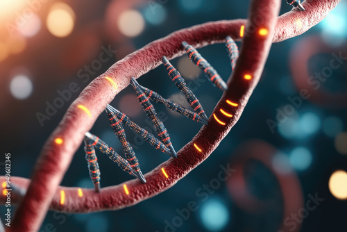 Molecular Blueprint of Life, vivid representation of a DNA double helix showcasing genetic coding with a glowing background and intricate molecular details suggesting advanced biology.