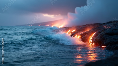 lava, ocean, volcanic, eruption, steam, fire, water, clash, nature, dramatic, molten, heat, wave, volcano, lava flow, contrast, coastal, geology, power, energy, landscape, glowing, explosion, natural, extreme, hot, cold, collision, environment, phenomena, smoke, magma, seascape, hazard, danger, science, adventure, shoreline, coastline, dynamic, creation, destruction