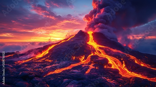 Molten lava streams down a volcanic mountain glowing brightly against the dramatic hues of a sunset sky and swirling smoke