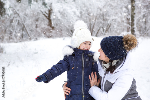 Mom and daughter hugging, looking at each other with love, on a walk. Winter entertainment outside, active recreation, fun in the cold in warm clothes. Outdoor recreation, fun childhood, strong family