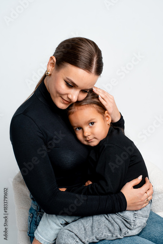 mom and daughter hugging on a white isolated background, a young happy family, mom or child
