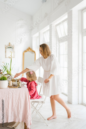 Mom and little daughter are sitting at a festive Easter table in the living room
