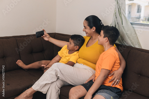 woman, mother, mobile phone, mobile, photo, three people, three, three, sibling, hispanic, people, technology, love, hug, kiss, motherhood, recreation, fun, home, television, sofa, television, watching, sitting, indoor, family, entertainment, children, room, motion picture, boy, leisure, living room, caucasian, brother, childhood, happy, lifestyle, look, watch, children, modern, young, show, enjoy, cartoon, background, food, little, popcorn