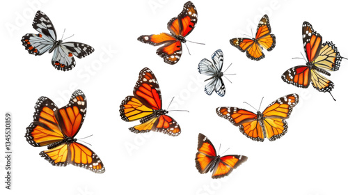 Monarch and plain tiger butterflies flying on transparent background