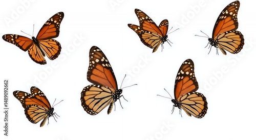 Monarch Butterflies Flying With Black Veins and Orange Wings Isolated by White Screen for Decoration