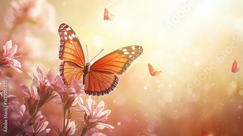 butterfly, monarch, flower, blossom, spring, summer, nature, insect, wing, pink, bloom, garden, sunlight, sunshine, light, beauty, delicate, vibrant, colourful, flora, fauna, wildlife, macro, closeup, detail, background, wallpaper, design, art, image, photo, picture, illustration, scene, environment, ecology, life, growth, pollen, orange, white, fragile, beautiful, magical, dreamy, serene, peaceful