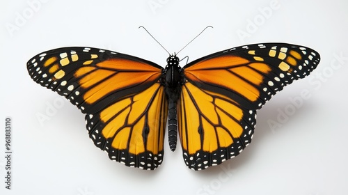 butterfly, monarch, insect, wing, white, background, orange, black, yellow, spot, pattern, nature, animal, macro, delicate, beautiful, vibrant, colourful, fragile, life, flying, flight, lepidoptera, fauna, wildlife, arthropod, antennae, leg, body, abdomen, chested, head, eye, scale, detail, texture, contrast, isolated, single, open, widener, symmetric, elegant, graceful, exquisite, intricate, wonders, wonder