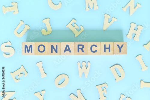 Monarchy government form concept. Wooden blocks typography flat lay in blue background.