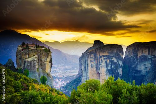 monastery, greece, meteor, unesco, cloister, trinity, greek, mountain, church, landmark, architecture, abbey, travel, tour tourism, cliff, visiting, tour, rock, christian, attraction, sunset, evening, dusk, trip