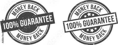 Money Back Guarantee stamp. 100% Money Back sign. Round grunge badge.