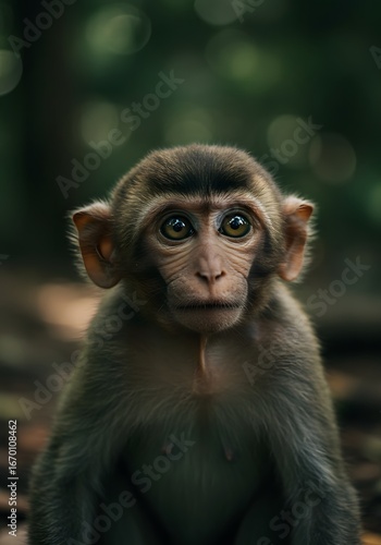 monkey, stare, closeup, furry, adorable, curious, serious, soft, vibrant, natural, jungle, forest, wildlife, animal, mammal, primate, face, eye, ear, fur, expression, bokeh, portrait, sharpened, brown, green, head, shoulder, background, light, dark, scene, nature, setting, looking, watching, observing, wild, cute, beautiful, detail, texture, image, photo, illustration, artwork