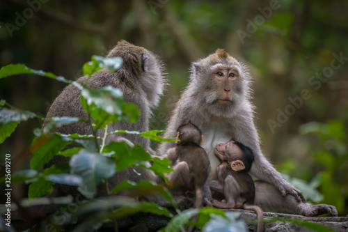 Monkeys (Macaca flavicularis) in Ubud Monkey Forest, Bali.