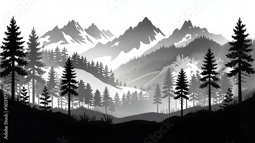 mountain, landscape, nature, forest, tree, pine, wilderness, scenery, panorama, black-and-white, monochromatic, grey, silhouette, misty, fog, layer, peak, summit, hill, vale, serene, calm, tranquil, remote, grand, majestic, beauty, environment, ecology, travel, adventure, minimalist, abstract, graphic, illustration, vector, art, design, alpine, rocky, snow, cloud, horizon, evergreen, timberland, peaceful, solitude