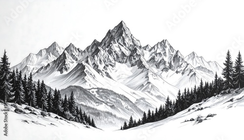 Monochromatic mountain range drawing, snow-capped peaks, and dark evergreen forests