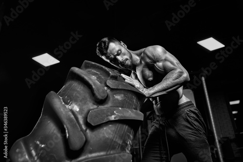 tire, wheel, push, exercise, flipping, bodybuilding, physical exercise, young, intense, heavy, athlete, gym, fit, lifting, training, club, active, weight, physical, sport, strength, muscular, tyre, fitness, large, activity, big, adult, strong, athletic, power, body, lifestyle, concentration, outfit, activewear, giant, person, attractive, interior, male, man, caucasian, dark, indoor, closeup, monochrome, black-and-white, from below