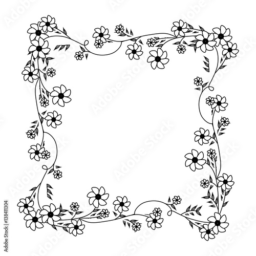 monochrome contour with square frame ornament with creepers and violet flowers vector illustration
