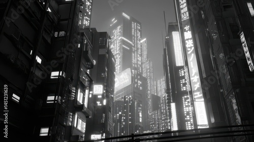 Monochrome Cyberpunk City with White Neon Lights and Sleek Minimalistic Buildings Transparent Background