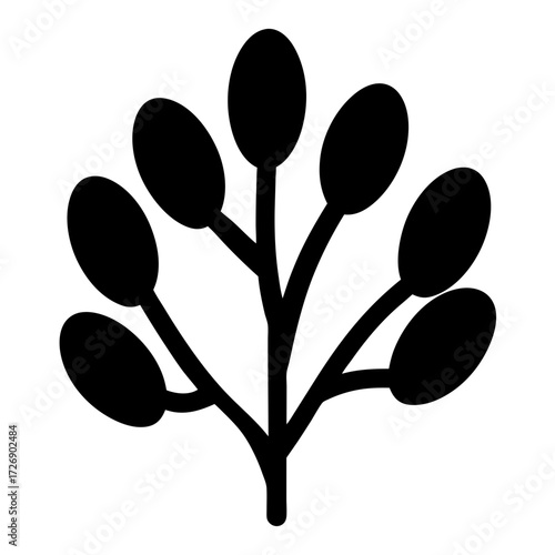 plant, botany, tree branch, leaf, stem, monochrome, black, white, silhouette, vector, nature, graphic, design, botanical, illustration, art, simple, minimalist, icon, symbol, shape, flora, foliage, berry, rounded, structure, organic, element, drawing, abstract, modern, decorative, twig, seed