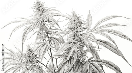 monochrome, hemp, plant, illustration, black, photo, shading, cross, hatching, depth, realism, artwork, intricate, detail, natural, beauty, complexity, artist, technique, palette, enhance, highlight, drawing, vignetting, botanical, design, texture, leaf, organic, creative