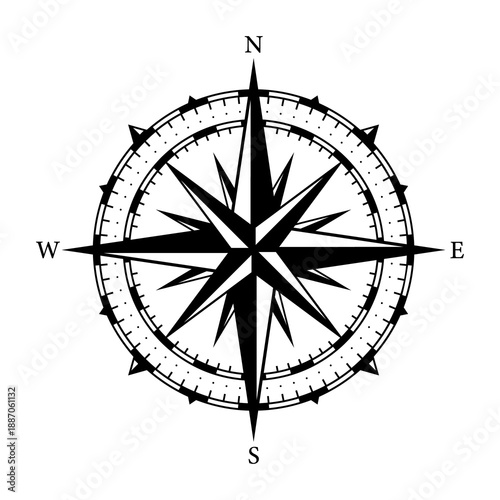 Monochrome Navigational Compass with Cardinal Directions of North, East, South and West