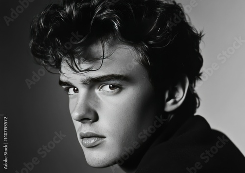 portrait, monochrome, man, young, face, hair, style, beauty, model, expression, head shot, studio, serious, glance, gaze, dark, moody, retro, vintage, classic, elegant, sophisticated, confident, attractive, male, person, human, adult, looking, eye, skin, texture, shadow, light, contrast, greyscale, greyscale, artistic, dramatic, intense, emotion, feeling, timeless, aethereal, refined, pensive, introspective, thoughtful
