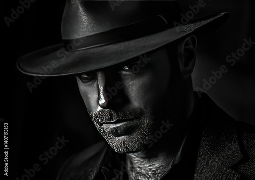 Monochrome Portrait of a Mysterious Man in Fedora, Shrouded in Shadowy Elegance