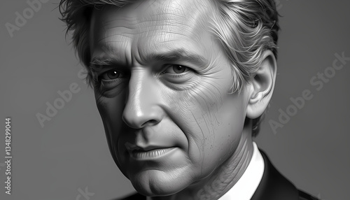 black-and-white, closeup, face, expression, serious, contemplative, eye, hair, light, shadow, contrast, texture, skin, wrinkle, forehead, eyebrow, nose, mouth, lip, chin, neck, collar, shirt, shoulder, background, dark, neutral, studio, lighting, depth, emotion, intensity, sharpened, detail, realism, artistry, photo, portrait, individual, person, human, male, adult, head shot, monochrome, greyscale, high contrast, dramatic