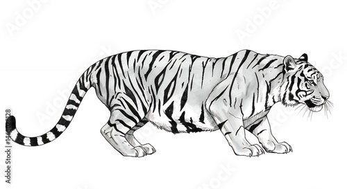 tiger, animal, wildlife, mammal, black, white, illustration, drawing, monochrome, profile, side, walking, stripes, isolated, fauna, graphic, vector, art, design, vignetting, black-and-white, nature, graphic design, wild animal, copy space, digital artwork, line art, image
