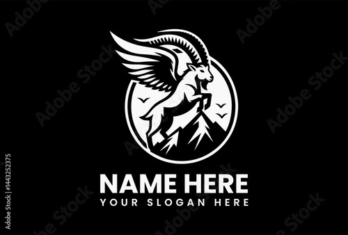 mountain, illustration, minimalist, fantasy, art, vector, graphic, design, white, black, goat, wing, animal, mythical, creature, majestic, powerful, soaring, peak, nature, symbol, icon, clip art, digital, creative, line art, simple, bold, isolated, background, artwork, shape, print, mascot