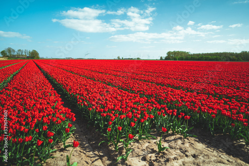 Monocultural tulip fields with bright vibrant colors, Dutch, Holland landschape Goeree-Overflakkee export industry