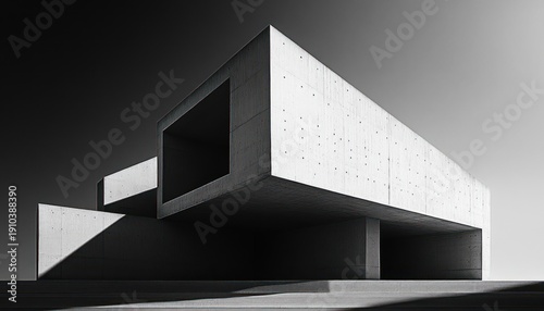 Monolithic minimalist concrete structure in stark black and white with cantilevered rectangular volumes casting dramatic shadows over an empty plaza, conveying a serene and austere mood