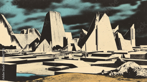 architecture, monolithic, structure, geometric, concrete, sky, dusk, abstract, sunlight, shadow, modern art, cube, pyramid, dramatic sky, abstract art, surreal, thought provoking, landscape