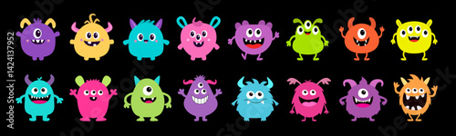 Monster icon set line. Happy Halloween. Cute cartoon kawaii colorful scary funny character. Eyes, tongue, hands up. Baby collection. Childish style. Sticker print. Flat design. Black background Vector