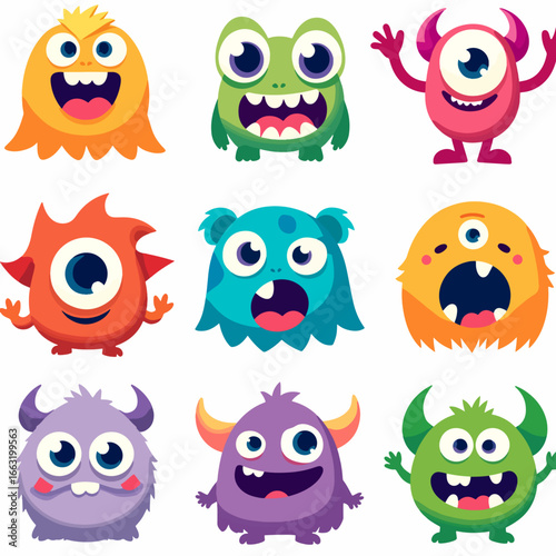 Monster icon set line. Happy Halloween. Cute cartoon kawaii colorful scary funny character. Eyes, tongue, hands up. Baby collection. Sticker print. Childish style. Flat design. White background Vector