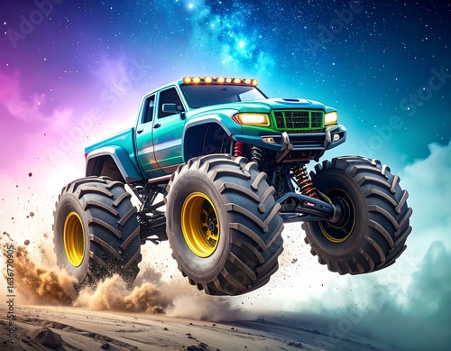 monster, truck, jump, dust, cosmic, night, sky, desert, vehicle, powerful, offroad, adventure, speed, action, terrain, large, tire, wheel, suspension, glow, colourful, digital, futuristic, leap, flying, energy, amazing, driving, speedy, extreme, challenge, fantasy, imagination, design, art, graphic, illustration, game, concept, racing, impact, motion, vehicle, offroad