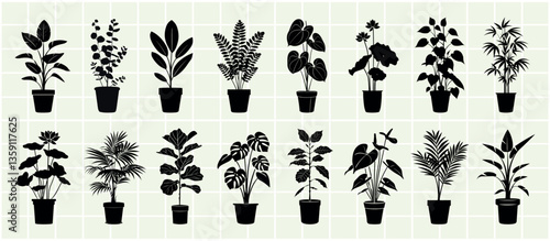 potted plants, illustration, collection, home decor, houseplant, silhouette, botanical, isolated, element, minimal, various, nature, plant, potted, vector, black, decor, mixed, set