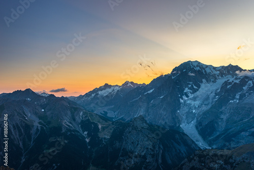 Monte Bianco sunset Mont Blanc summit (4810 m) and his melting glaciers. View from 3000 m in Valle d'Aosta. Summer adventures on the italian french Alps.