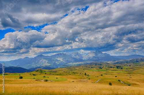 Montenegro, national park Durmitor, mountains and clouds panorama. Sunlight lanscape. Nature travel background