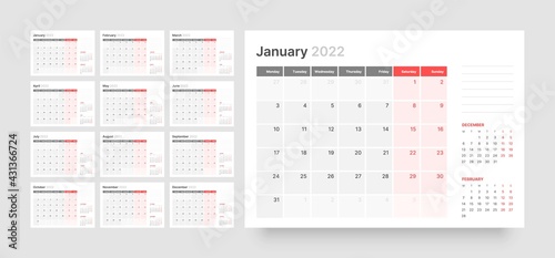 2022, calendar, planner, template, monday, english, year, wall, desktop, grid, desk, 12, horizontal, month, layout, vector, date, quarterly, print, design, diary, graphic, organiser, simple, week, monthly, schedule, season, modern, annual, daily, business, clean, remind, quarter, almanac, note