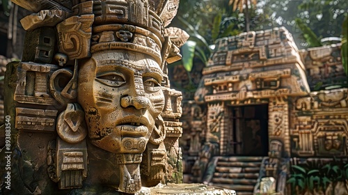 closeup, aztec, statue, head, stone, carved, rock, figure, ancient, monumental, pyramid, outdoors, culture, civilisation, intricate, detail, decoration, majestic, history, historic, travel, america, tour tourism, natural, environment, god, contemplation, character