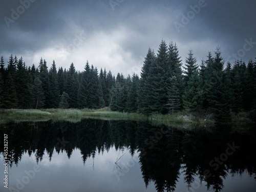 Moody and silent pond without people with calm and deep atmosphere, trees reflections on the water in the middle of nature park Jizera mountains, Czech Republic.