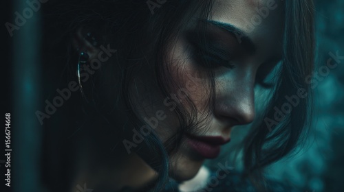 Moody closeup portrait of a woman with dark hair teal tones