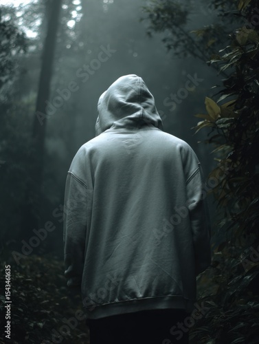 backview, moody, atmospheric, model, nature, misty, dark, photorealistic, wanderlust, hiking